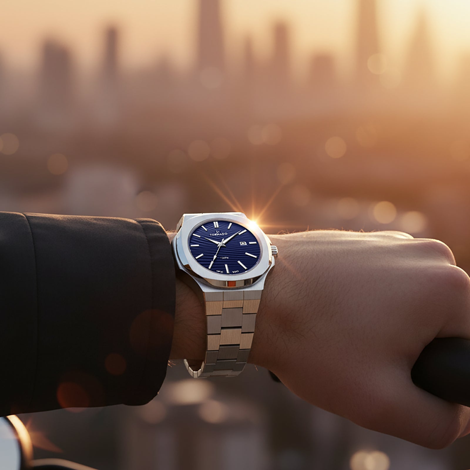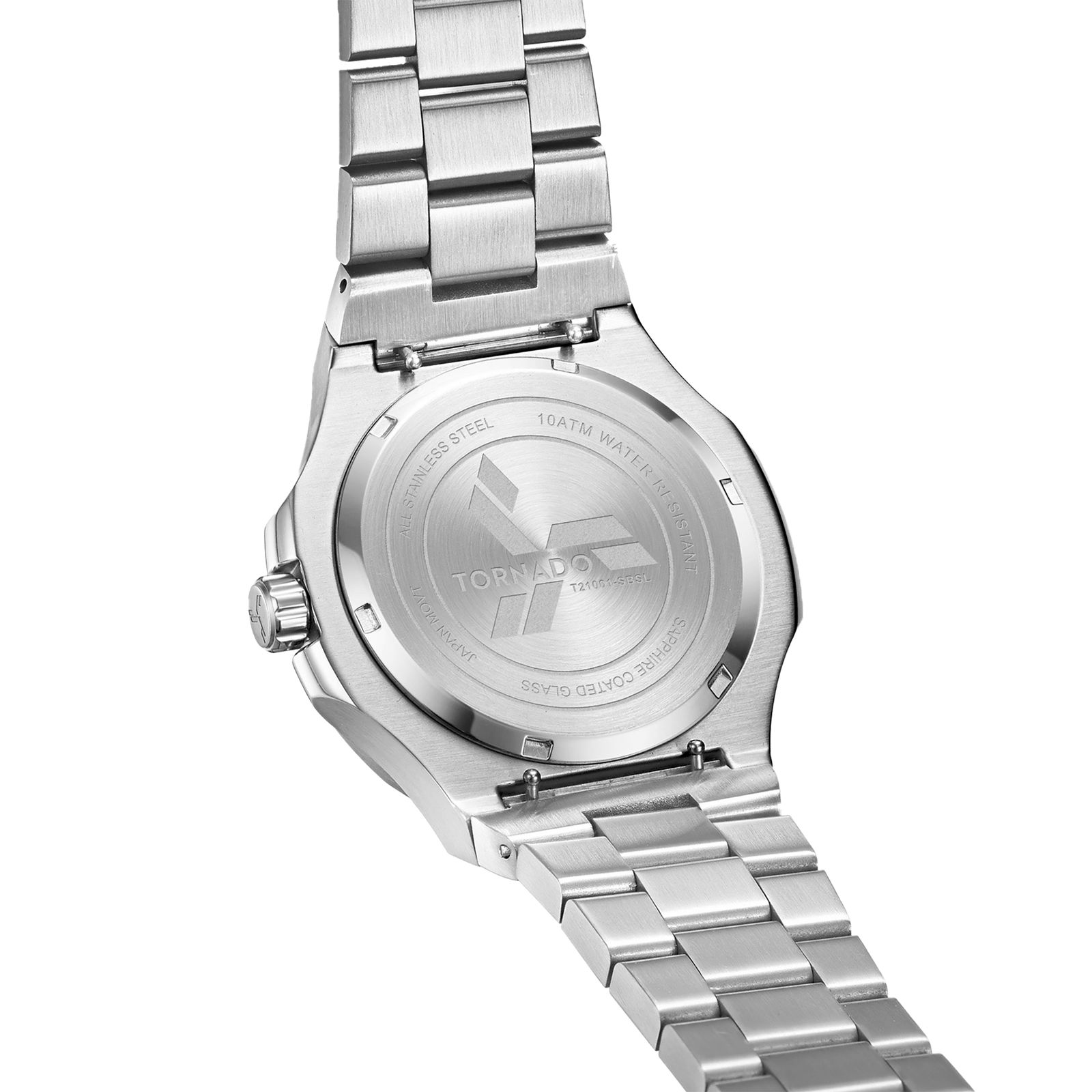 Tornado Aurora Eon Men’s Watch with blue dial, silver stainless steel case and strap. Japan Quartz movement ensures accuracy. Sapphire glass protects dial. Water resistant 5ATM. 3-year warranty included.