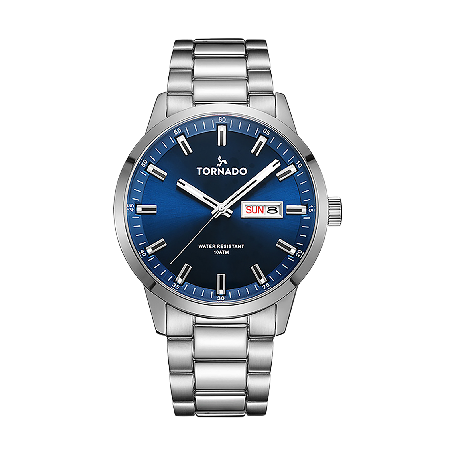Tornado Spectra Men’s Watch with blue dial, silver case and strap. Miyota 2305 movement, dome sapphire coated glass. 10ATM water resistant. 3-year warranty included.
