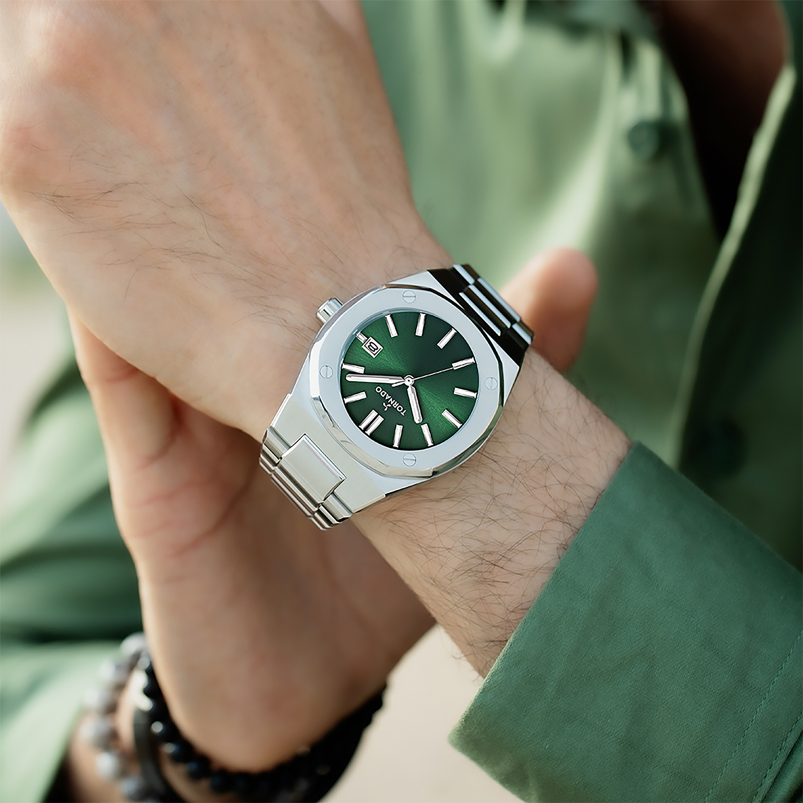 Tornado Aurora Twilight Men’s Watch with green dial, silver case, and strap. Powered by Japan 2316 movement with sapphire coated glass. Water resistant 10ATM. 3-year warranty included.