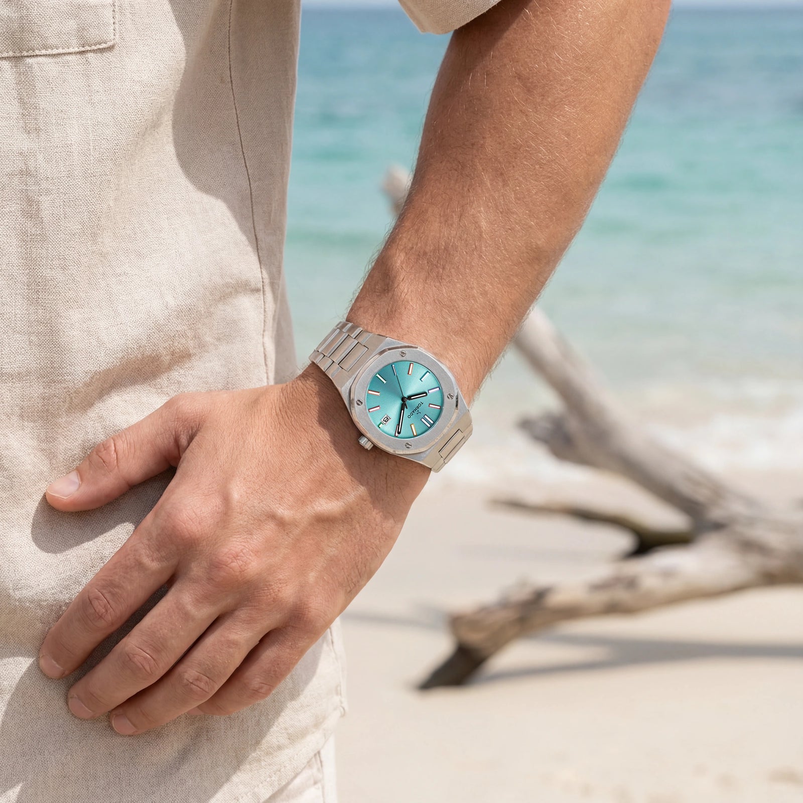 The T23003 SBSL takes a classic case shape and gives it a fresh, playful twist. The Tiffany blue sunray dial instantly pops, while the multi-color luminous markers add a subtle hit of color that comes alive at night. It’s the watch you wear with white sneakers and a tee, a linen shirt at brunch, or a casual blazer when you want your wrist to do the talking. The integrated 316L stainless-steel bracelet and 42mm octagonal-bezel case keep the look grounded in luxury, with brushed links and polished sides that feel as good as they look. Inside, the Miyota 2315 Japanese quartz movement with date display sits under a sapphire-coated crystal, and 10 ATM water resistance keeps up with real life. It’s a men’s luxury stainless-steel watch that looks laid-back, but feels seriously high-end.