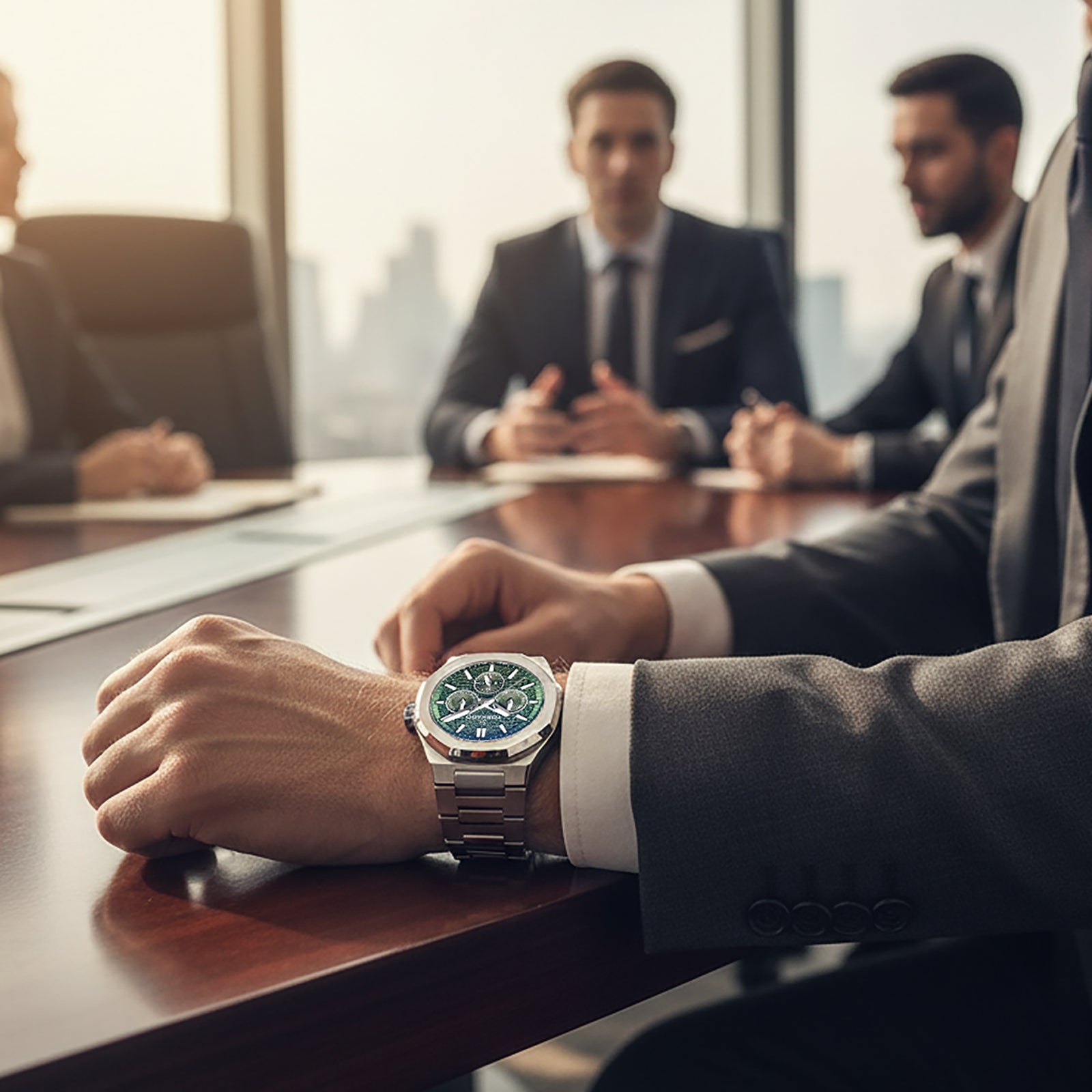 Tornado Aurora Nova Men's Watch with green dial, silver case and strap. Miyota 6P29 multi-function movement with sapphire coated glass. 10ATM water resistant. 3-year warranty included.