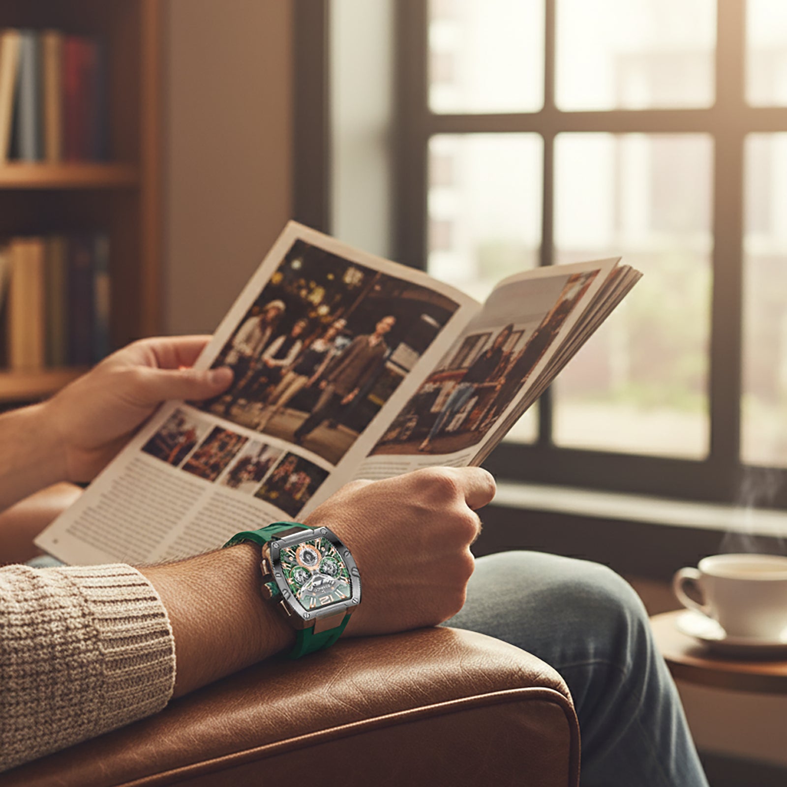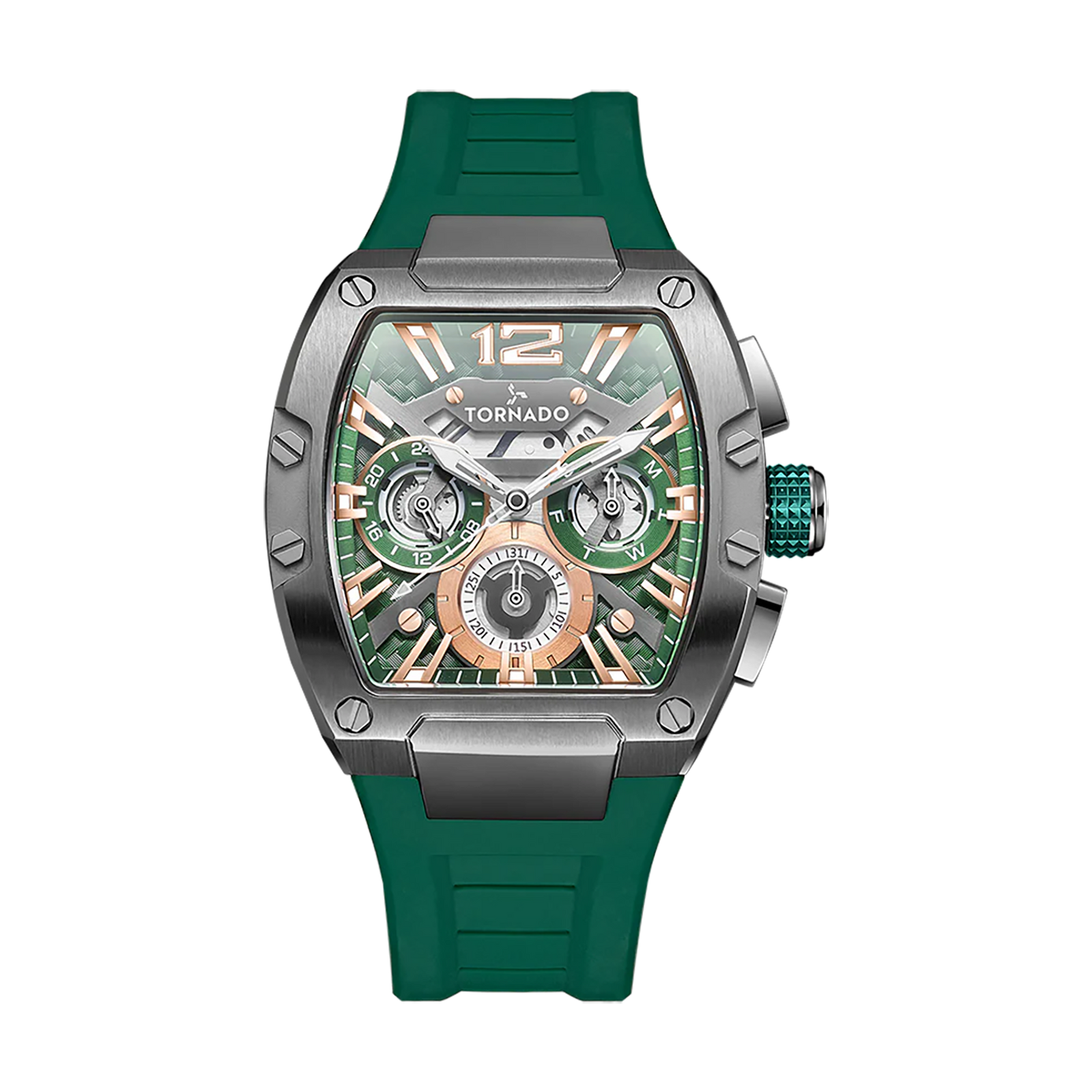 Tornado Xenith Men's Watch with green dial, gunmetal case and green silicone strap. Powered by VX9J high-precision Japanese quartz. Sapphire coated curved crystals. 10ATM water resistant. 3-year warranty included.