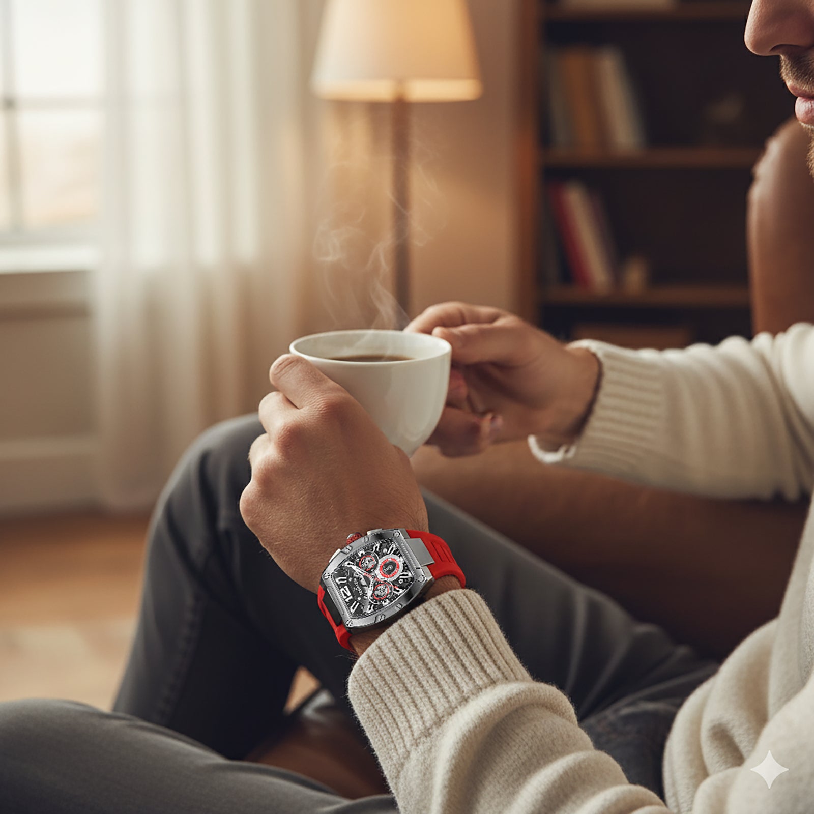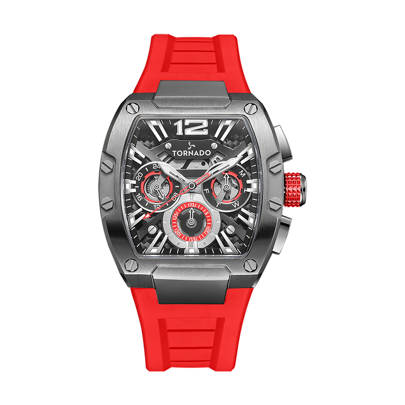 Tornado Xenith Men's Watch with black dial, gunmetal case and rose gold silicone strap. VX9J high-precision Japanese quartz movement. Sapphire coated curved crystals. 10ATM water resistant. 3-year warranty included.