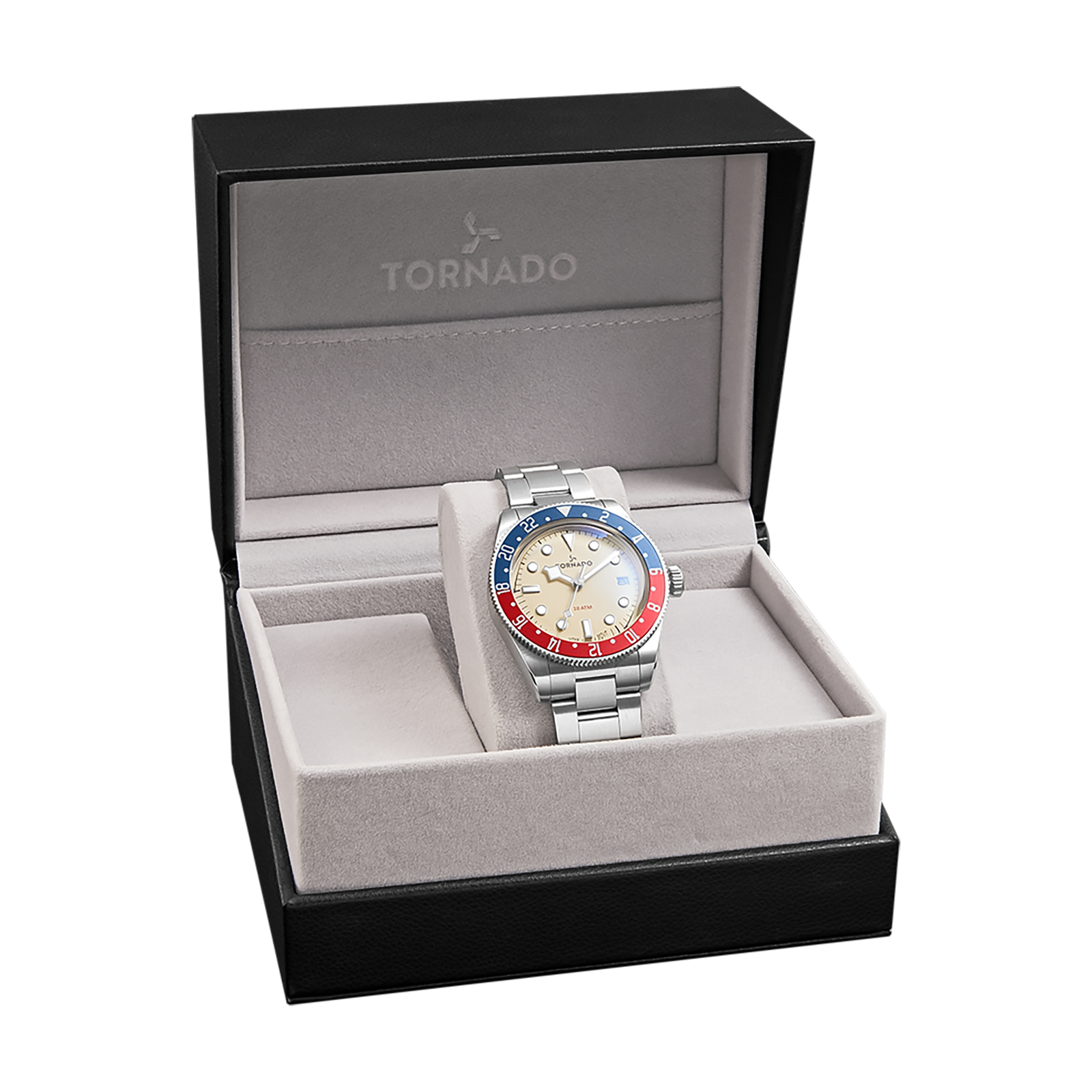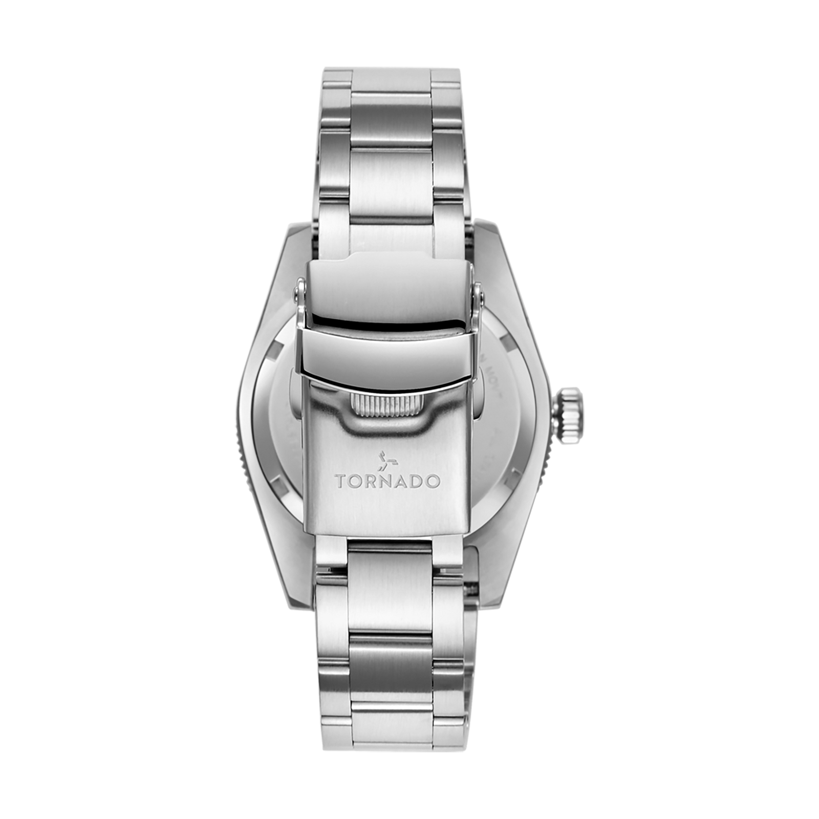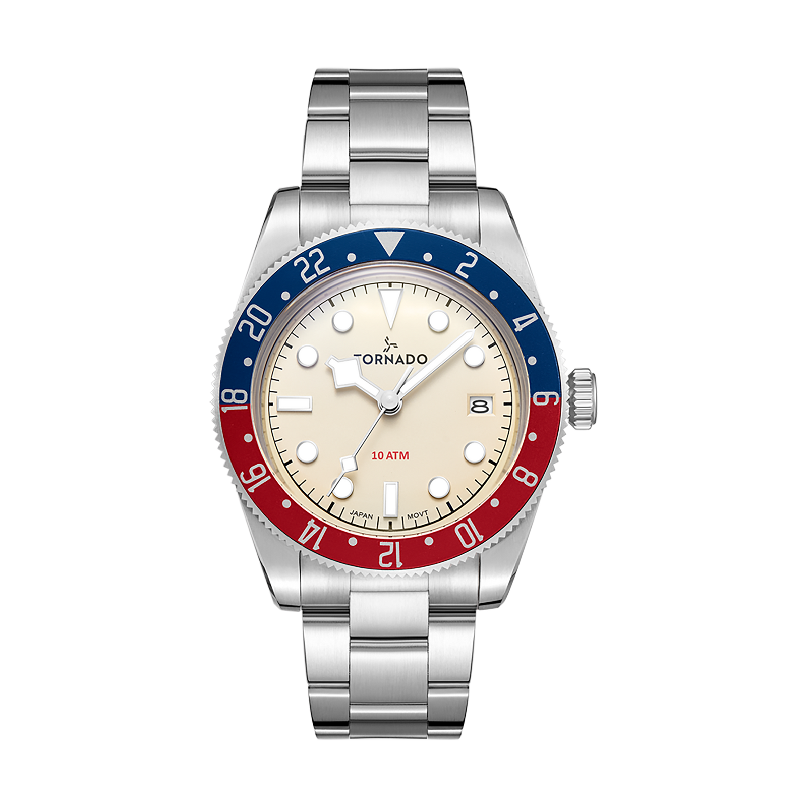 Tornado Lumina Date Just Men’s Watch with beige dial, silver case, and strap. Japan 2315-3H movement, sapphire coated glass. 10ATM water resistant. 3-year warranty included.