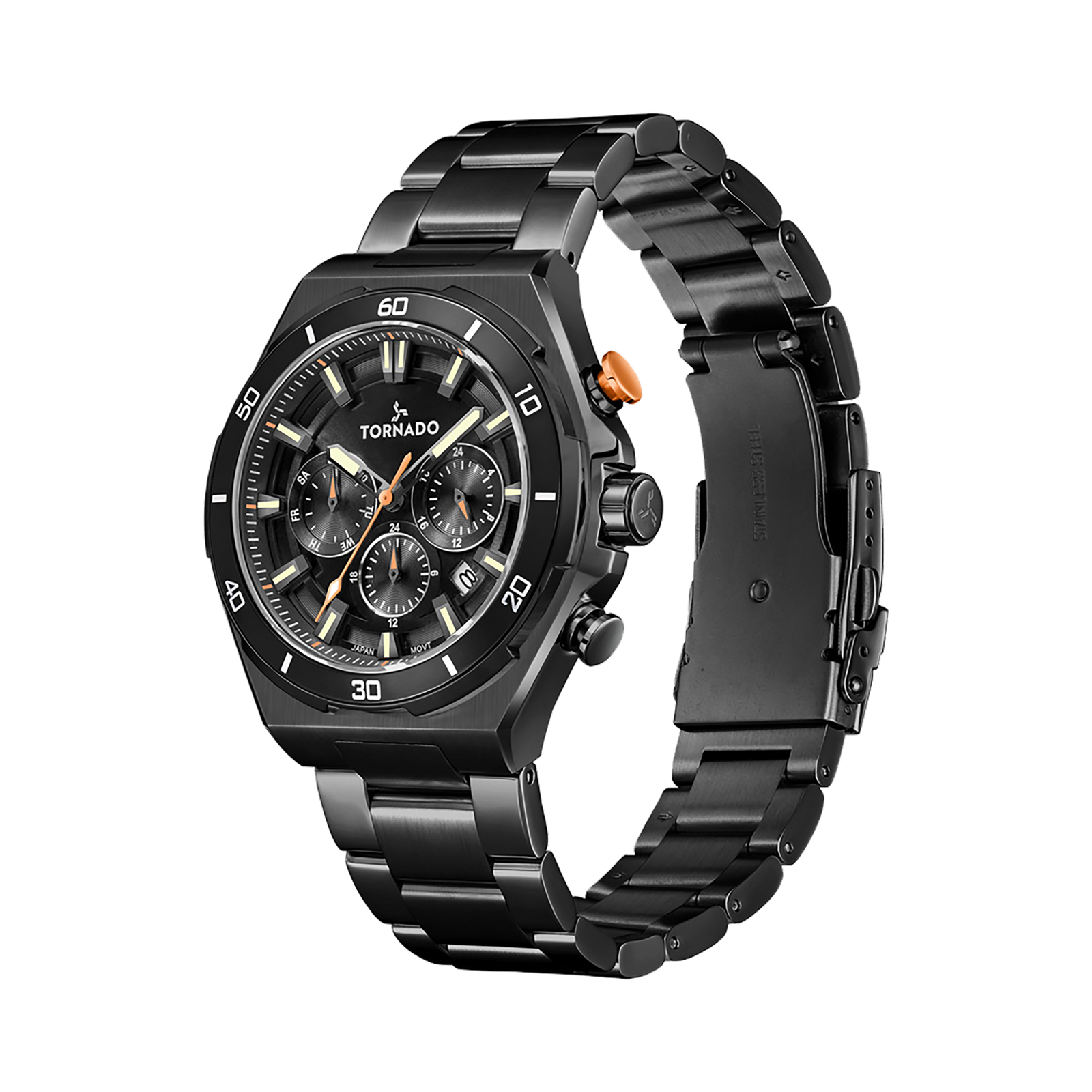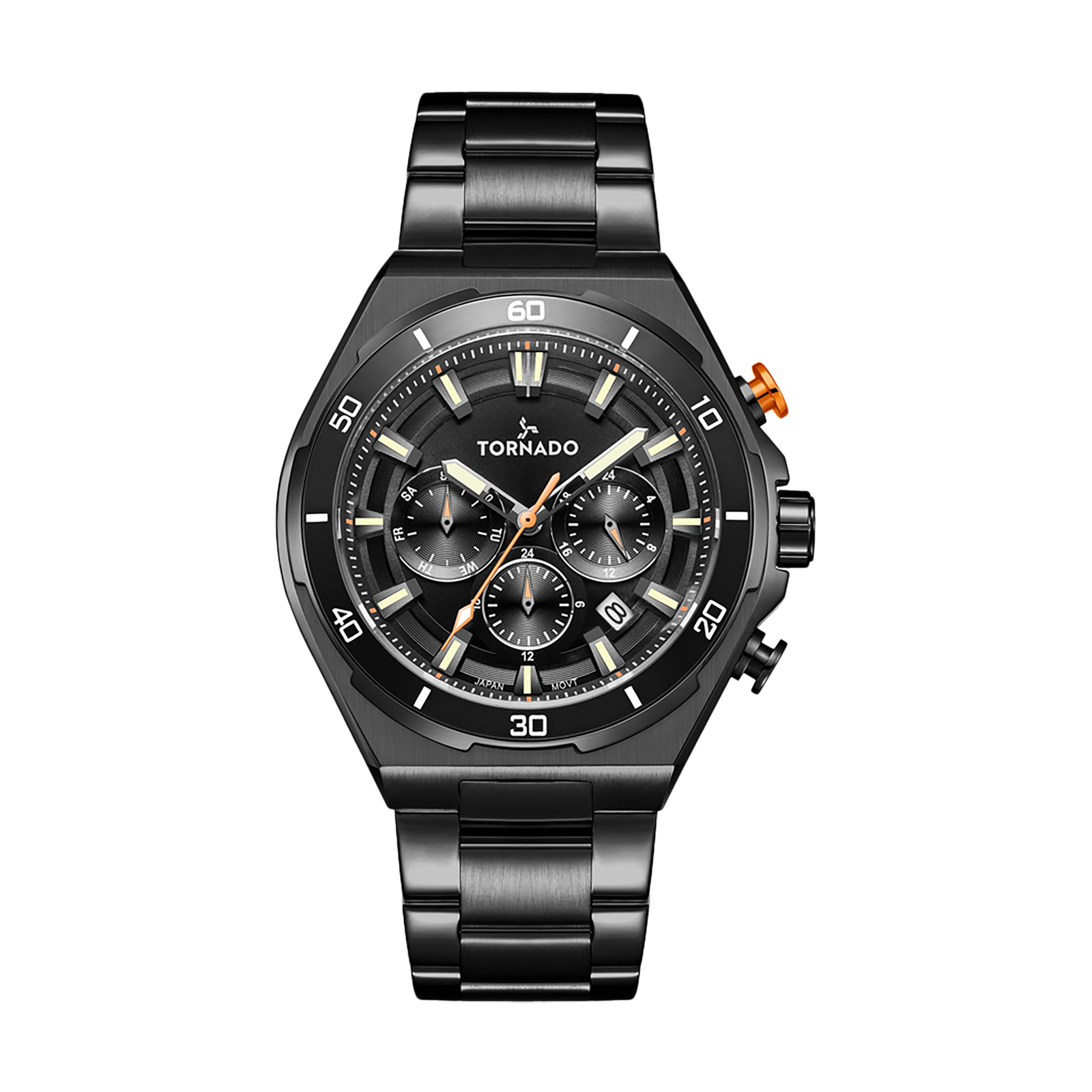 Tornado Strellar X Men's Watch with black dial, black case, and strap. JP25 multi-function movement with sapphire coated glass. 10ATM water resistant. 3-year warranty included.