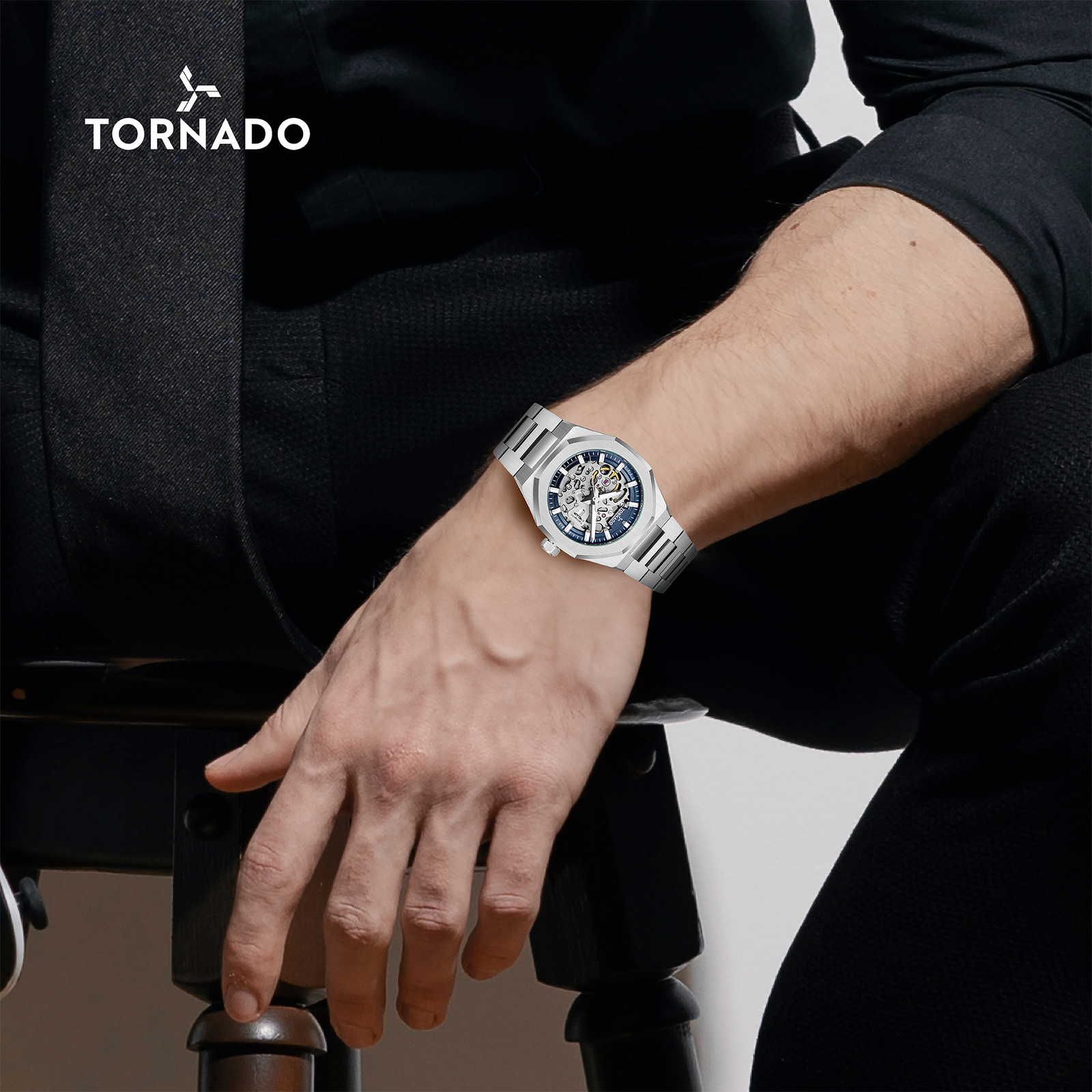 Tornado Autonova Men's Automatic Watch with blue dial, silver case, and strap. TMI NH70 movement with sapphire coated glass. 10ATM water resistant. 3-year warranty included.
