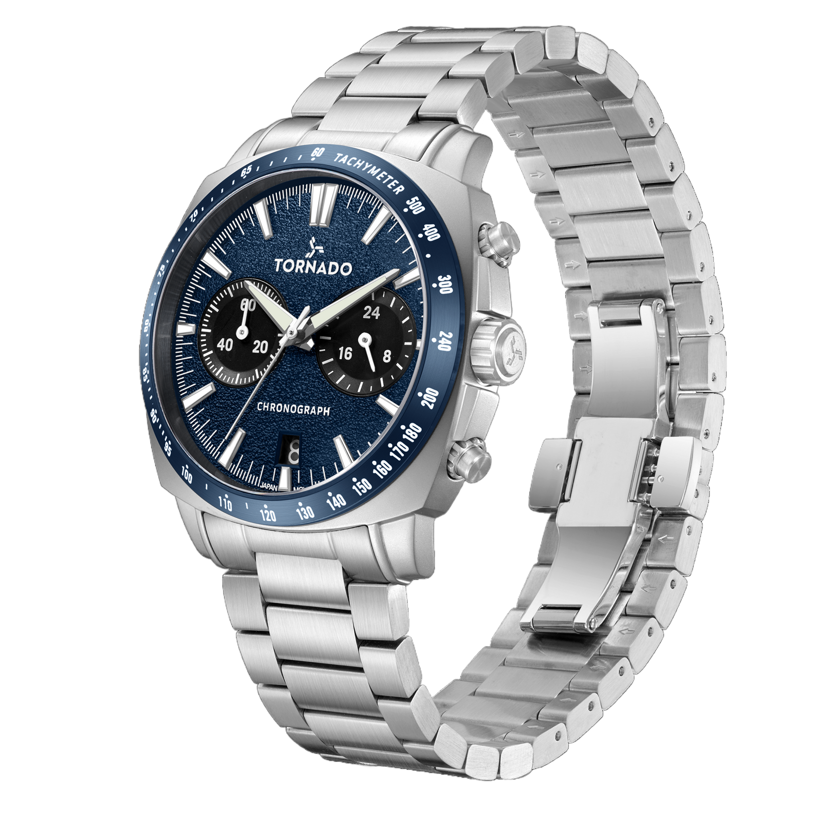 This Tornado chronograph watch offers a clean steel profile with a vivid blue dial for a sharp, modern look. The 42 mm case is crafted from solid 316L stainless steel and finished in a square form with a rounded bezel. The blue dial features a matte sand-textured surface with a fine-grain finish, protected by sapphire glass for everyday scratch resistance. Power comes from the Seiko VK64 chronograph movement, for prolonged, reliable accuracy. A solid stainless steel bracelet with brushed links completes the design and is secured with a butterfly buckle for a seamless fit.