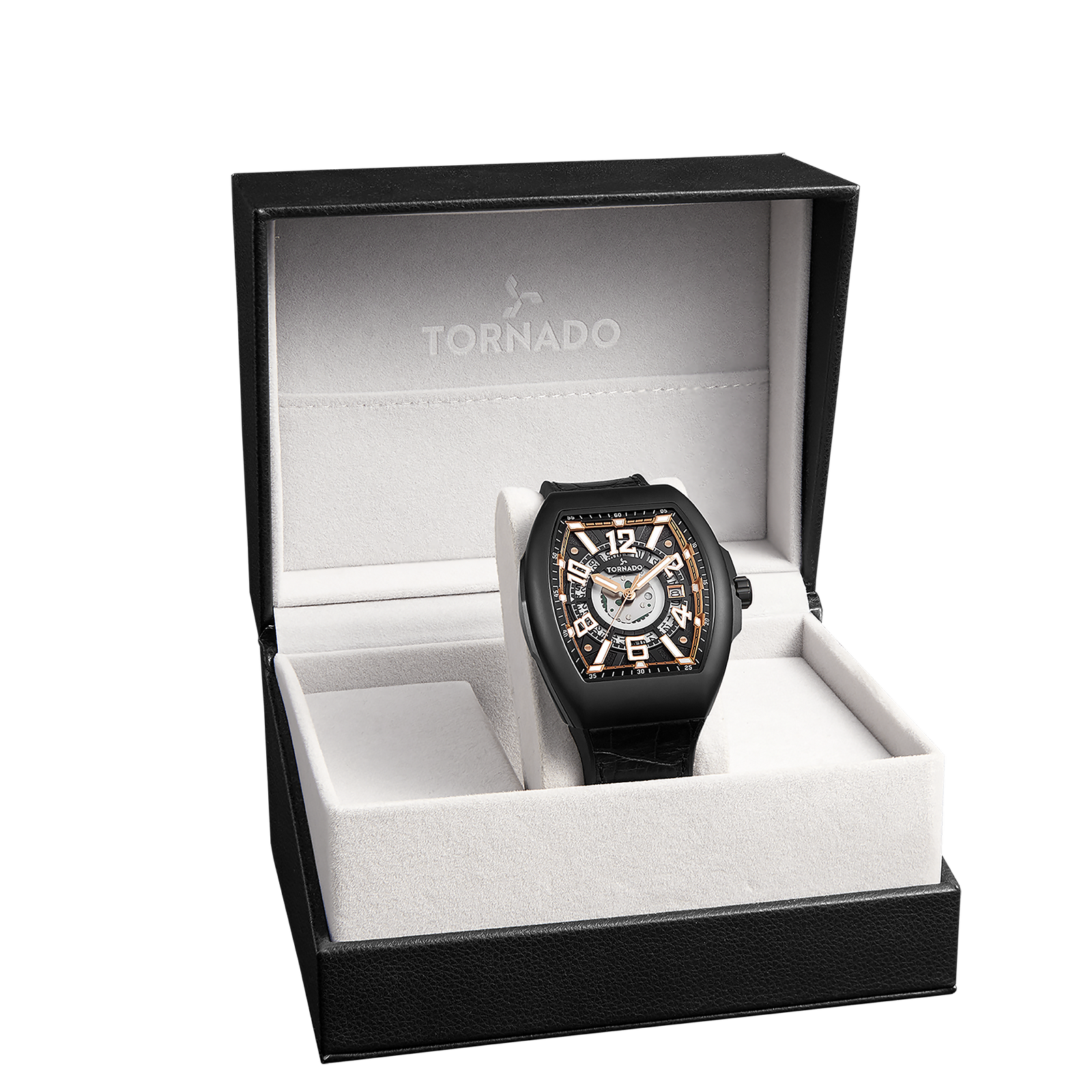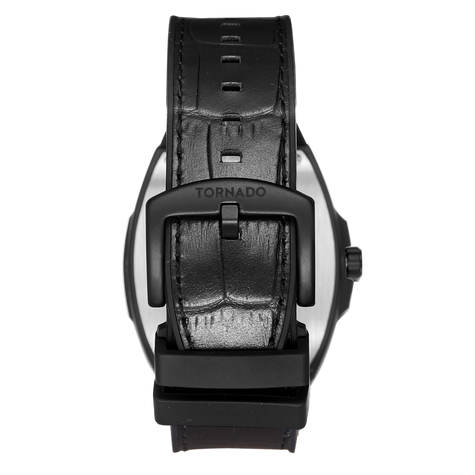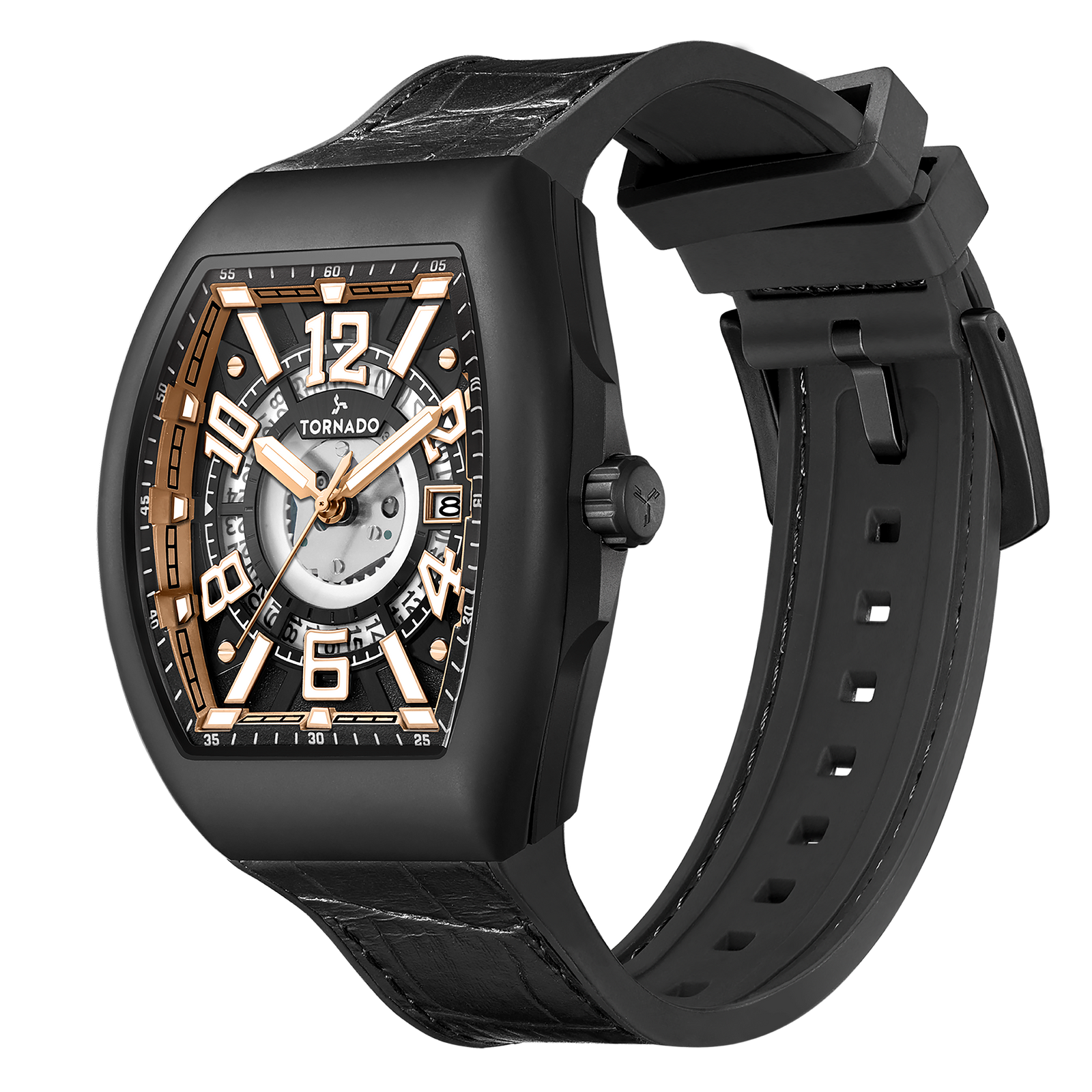 Tornado Xenith Men’s Analog Watch with black dial, black case, and leather-rubber strap. 2315-3 Japanese quartz movement, sapphire coated glass. 5ATM water resistant. 3-year warranty included.