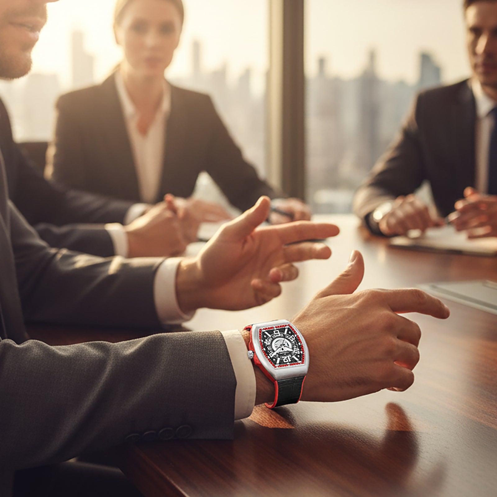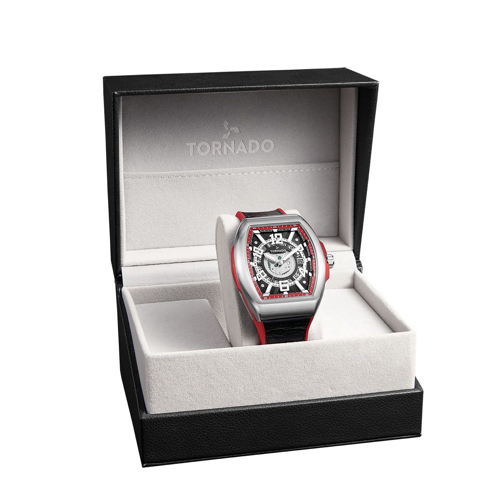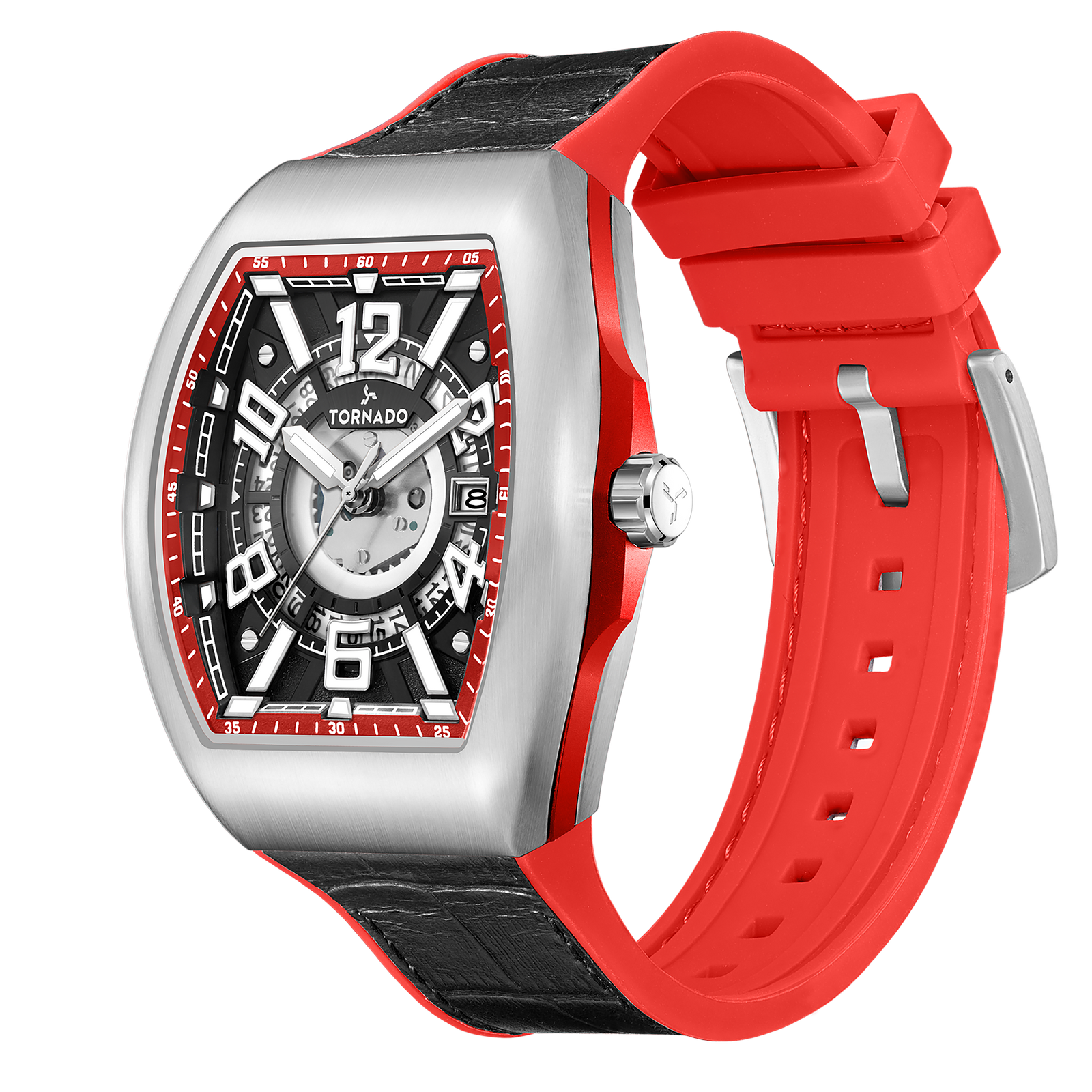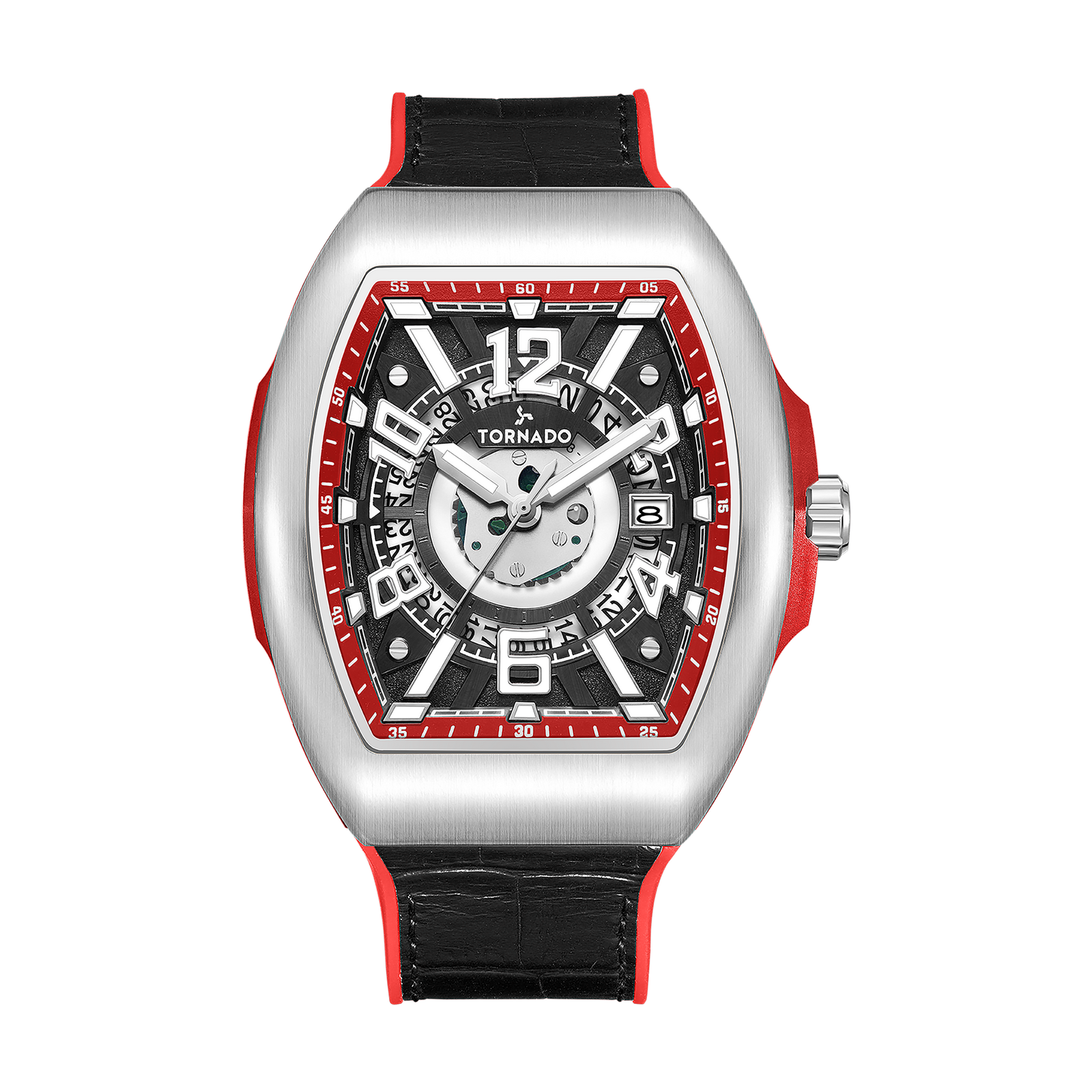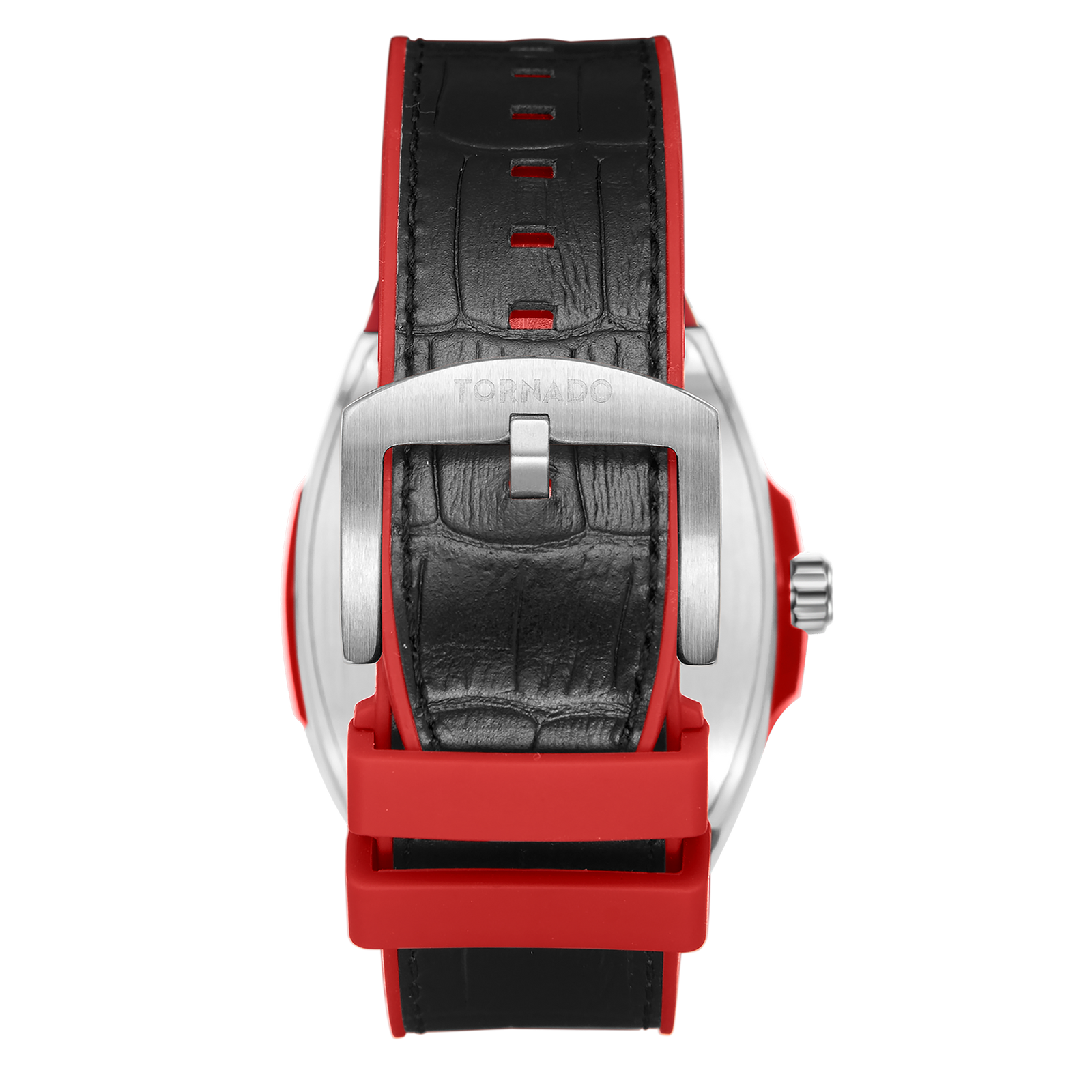 Tornado Xenith Men’s Analog Watch with black dial, silver case, and black leather-rubber strap with red lining. 2315-3 Japanese quartz movement, sapphire coated glass. 5ATM water resistant. 3-year warranty included.