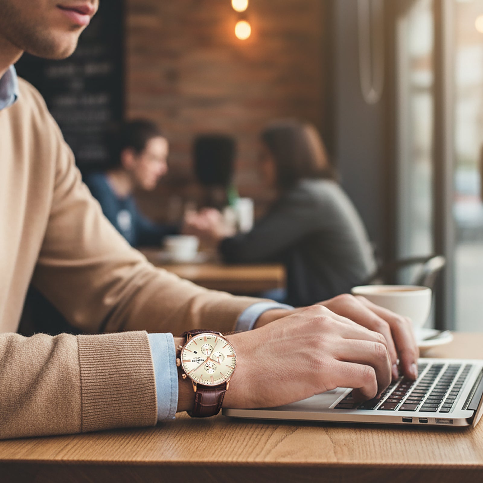 Tornado Celestia Elite Men's Chronograph Watch with beige dial, rose gold case and brown leather strap. Japan Quartz movement, sapphire coated glass, 10ATM water resistant. 3-year warranty included.
