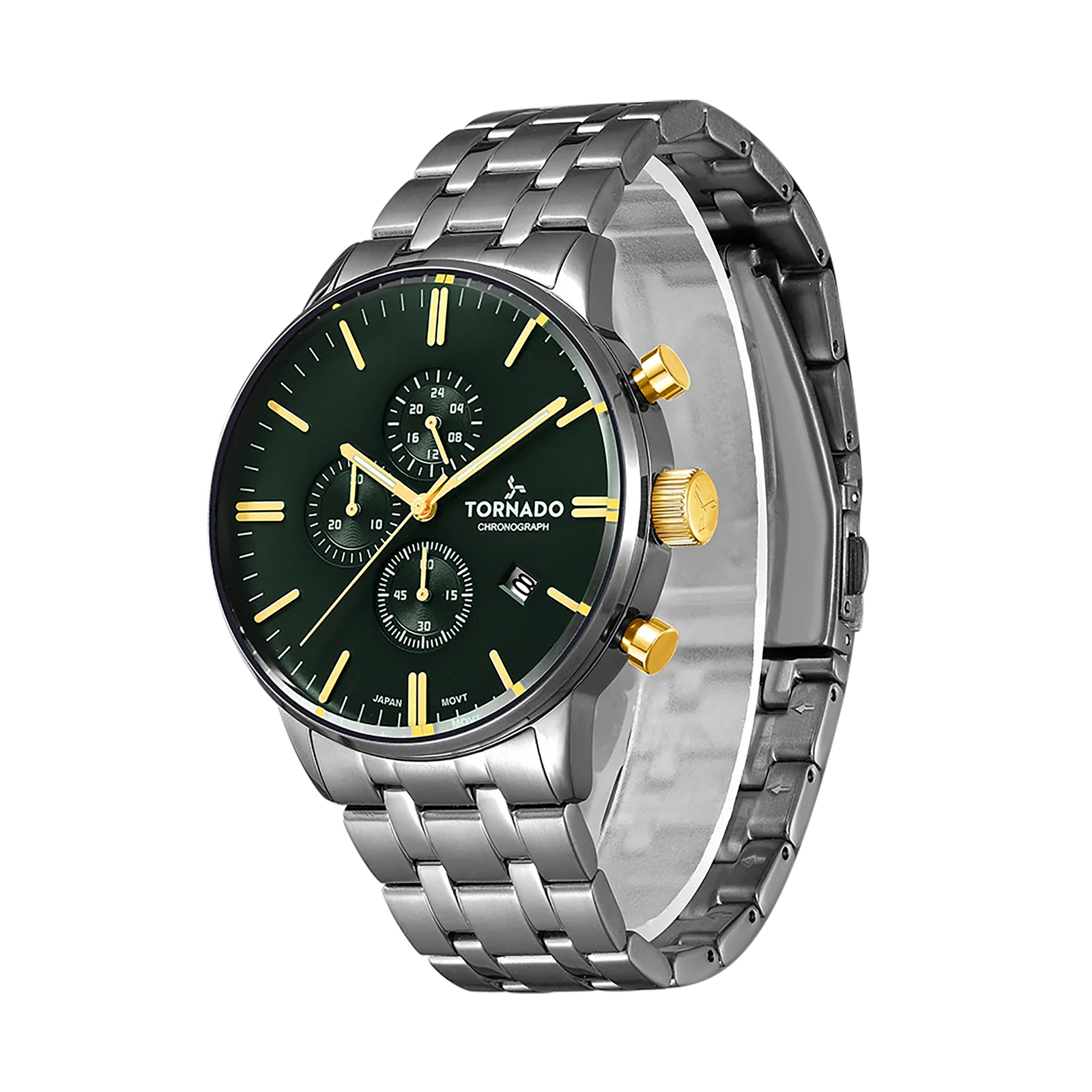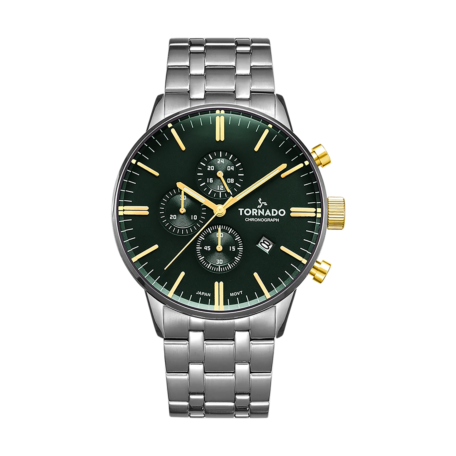 The CELESTIA ELITE in silver presents a contemporary interpretation of a classic chronograph form. Its 43 mm round case is crafted from 316L silver-toned stainless steel, combining brushed and polished surfaces to create depth and contrast across the profile. The matching stainless-steel bracelet follows the same alternating finishes, giving the watch a cohesive, well-balanced presence on the wrist. A solid deployant buckle ensures a secure and refined closure. The green dial adds character, offering a rich backdrop for the chronograph layout, with luminous detailing for visibility after dark. Three subdials are neatly arranged along with a discreet date display that integrates neatly into the composition. Sapphire-coated glass covers the dial, maintaining clarity and offering resistance against daily wear. Powering the watch is the Miyota JS15 chronograph movement, chosen for its reliable performance and precise timekeeping. With a water resistance rating of 10 ATM, the Celestia Elite is built with everyday durability in mind, extending its usefulness beyond formal settings. A three-year warranty completes the package, reinforcing the focus on long-term reliability and solid construction.