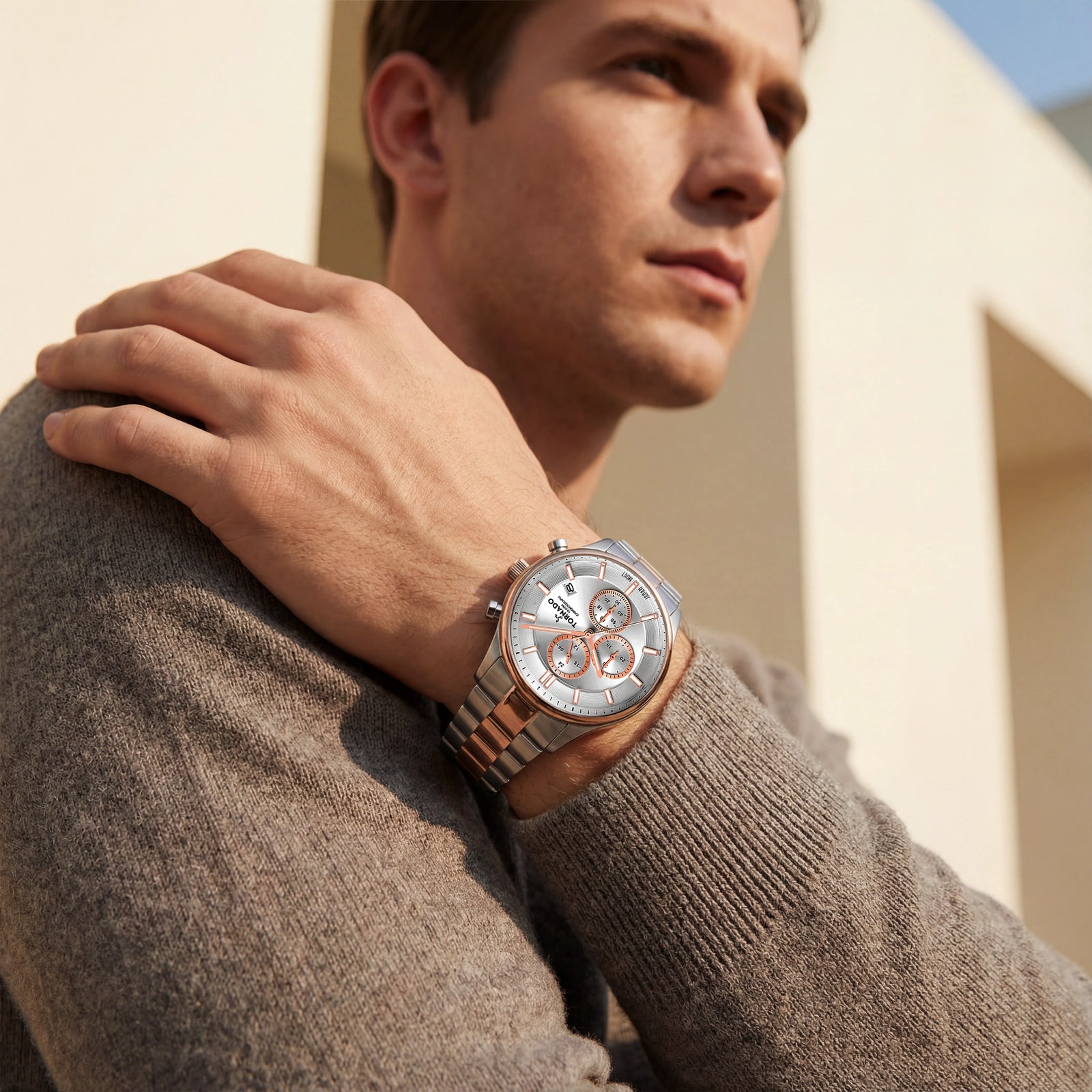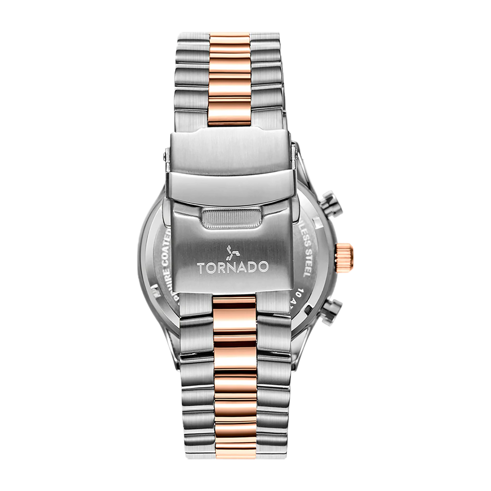 The Tornado Celestia Elite chronograph in two-tone rose gold presents a delicate balance of contrast. The 42 mm round case is formed from solid stainless steel and finished with brushed and polished surfaces, giving structure to the warm rose-gold tone. A matching two-tone stainless-steel bracelet, with polished outer links and brushed centre links completes the structure and closes securely with a solid deployant buckle. The white dial brings clarity and restraint to the design. The clean surface allows the applied markers and hands to stand out, while three chronograph subdials are arranged at 12, 9 and 6 positions respectively. A sapphire-coated crystal protects the dial, chosen for its ability to maintain visual clarity over time. Inside, the watch is driven by the Miyota JS25 chronograph movement, valued for stable performance and dependable timekeeping. With a water resistance rating of 10 ATM, the Celestia Elite is well suited to daily wear and routine exposure to water, in addition to being backed by a 3-year warranty from Tornado.