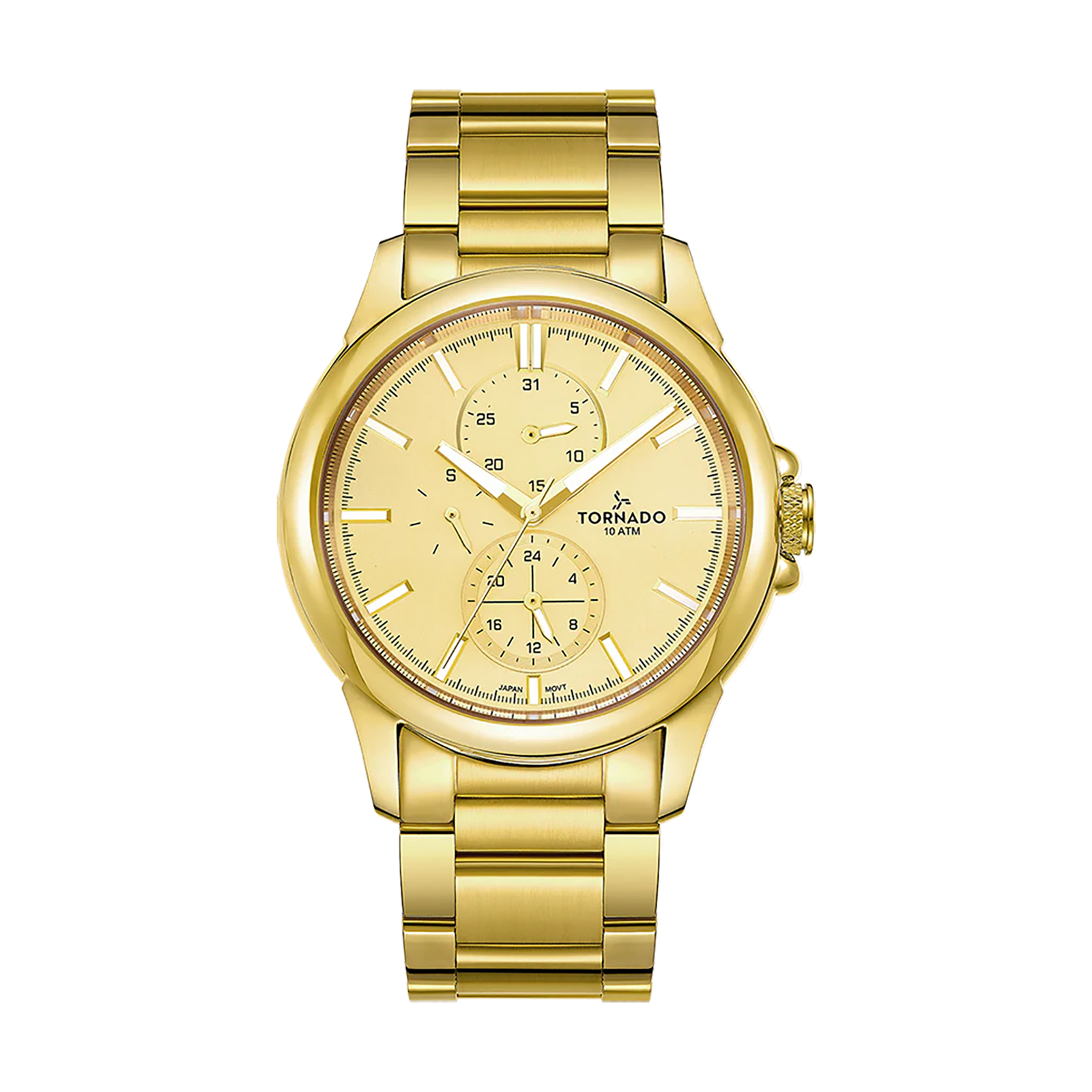 Tornado Celestia Elite Men's Multi Function Watch with beige dial, gold case and strap. Japan Quartz movement, mineral glass, 10ATM water resistant. 3-year warranty included.