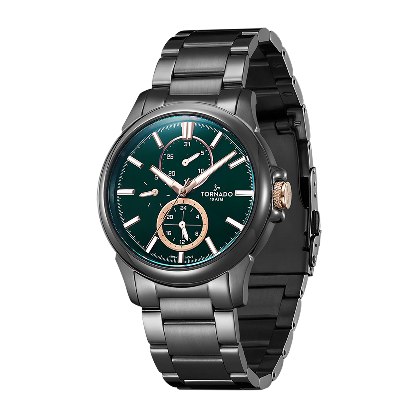 Tornado Celestia Elite Men's Multi Function Watch with green dial, gunmetal case and strap. Japan Quartz movement, slight dome sapphire coated glass, 10ATM water resistant. 3-year warranty included.
