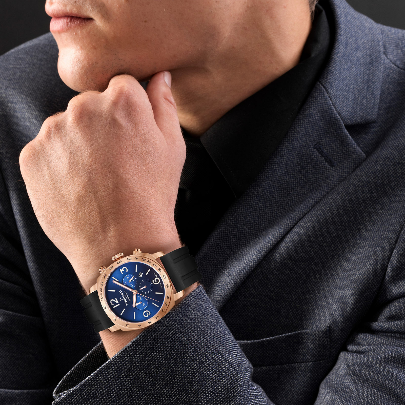 Tornado Lumina Chronosphere Men's Chronograph Watch with blue dial, silver/rose gold case, black silicone strap. Japan Quartz movement, sapphire coated glass, 10ATM water resistant. 3-year warranty included.