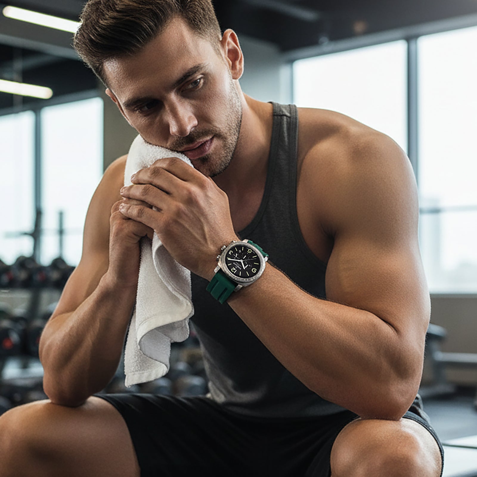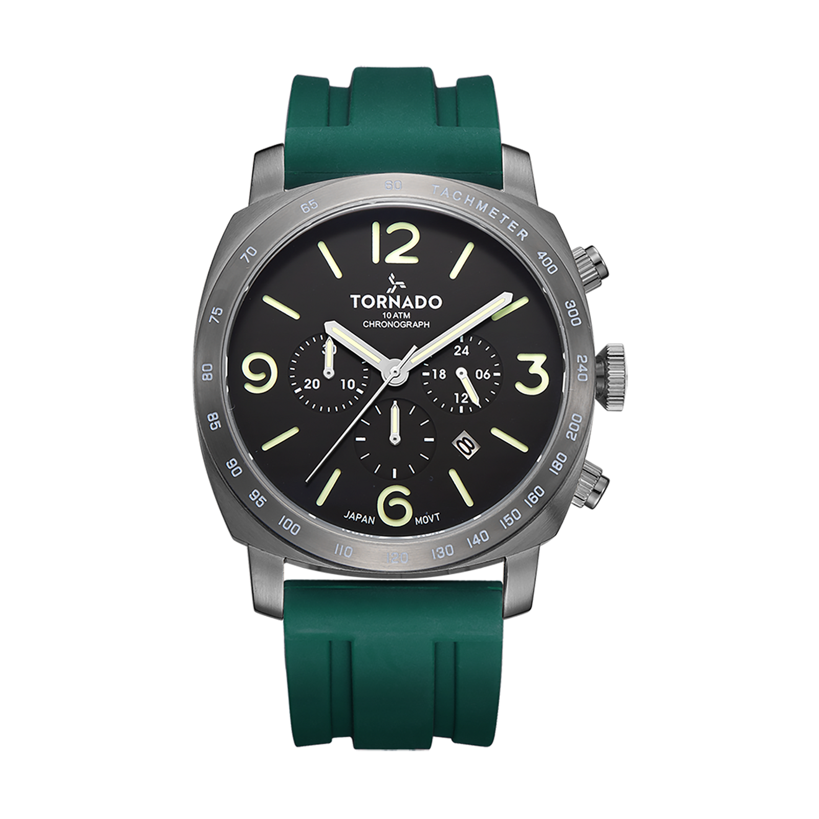 Tornado Lumina Chronosphere Men's Chronograph Watch with black dial, gunmetal case, green silicone strap. Japan Quartz movement, sapphire coated glass, 10ATM water resistant. 3-year warranty included.
